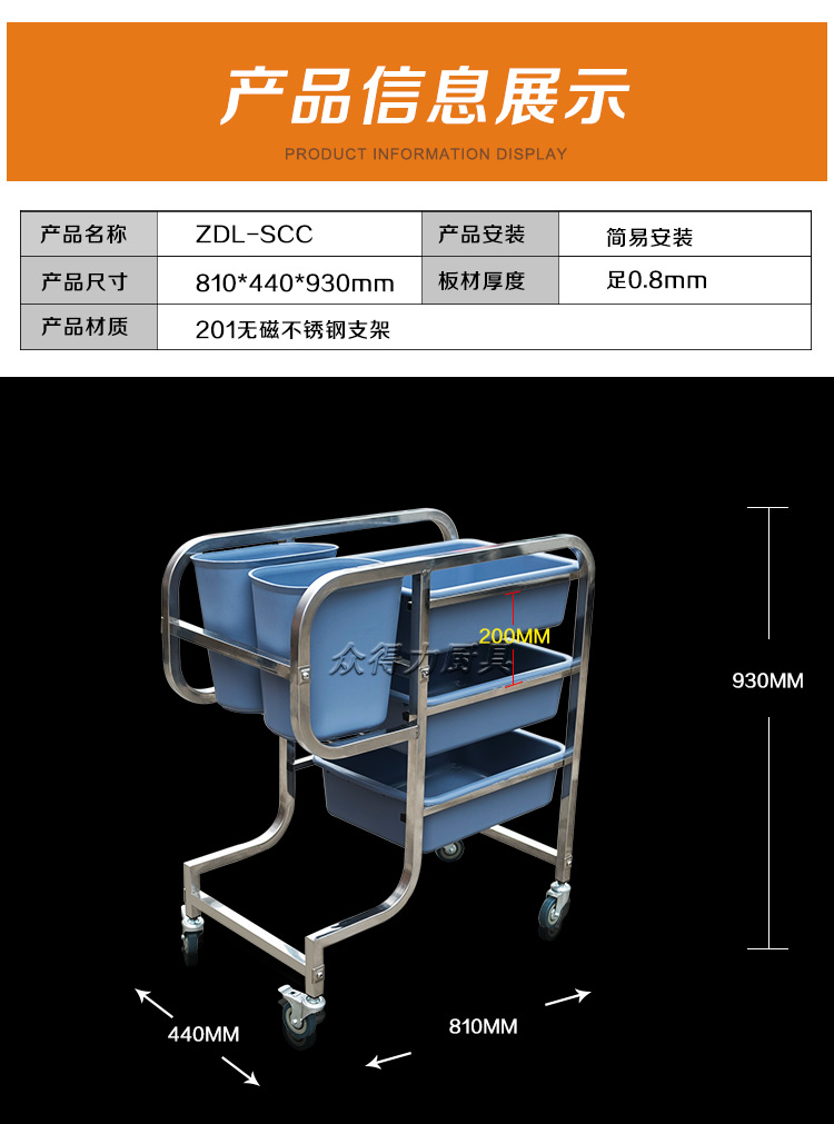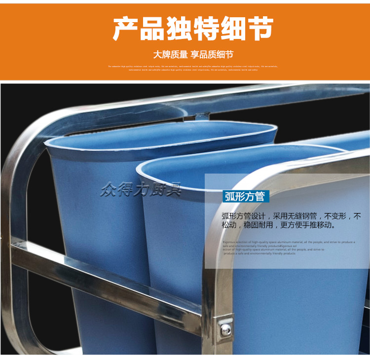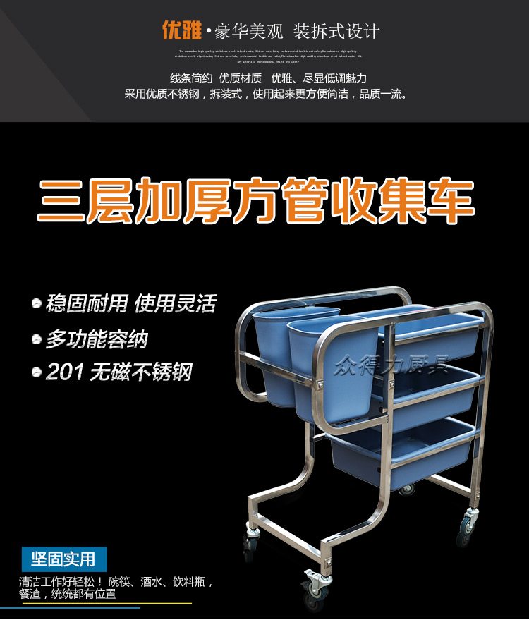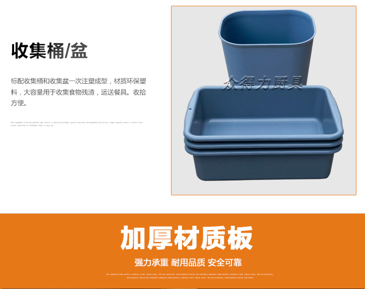 江西眾得力廚具有限公司生產(chǎn)銷售商用廚具,白鋼調(diào)理系列設(shè)備及食品機械,提供中央廚房工程項目整體解決方案。不銹鋼收集車有方管和圓管之分,組裝式,拆卸清洗方便,采用標配足0.8mm201無磁不銹鋼加工設(shè)計。外形美觀,設(shè)計精量,符合餐飲食品衛(wèi)生需求。