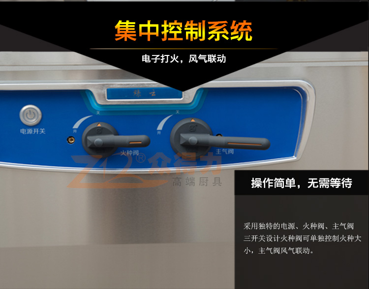 它,簡約的設計理念,一鍵點火,風氣聯動,落成其簡約而不簡單的外觀,充分考慮廚師使用方便,后期維護方便。